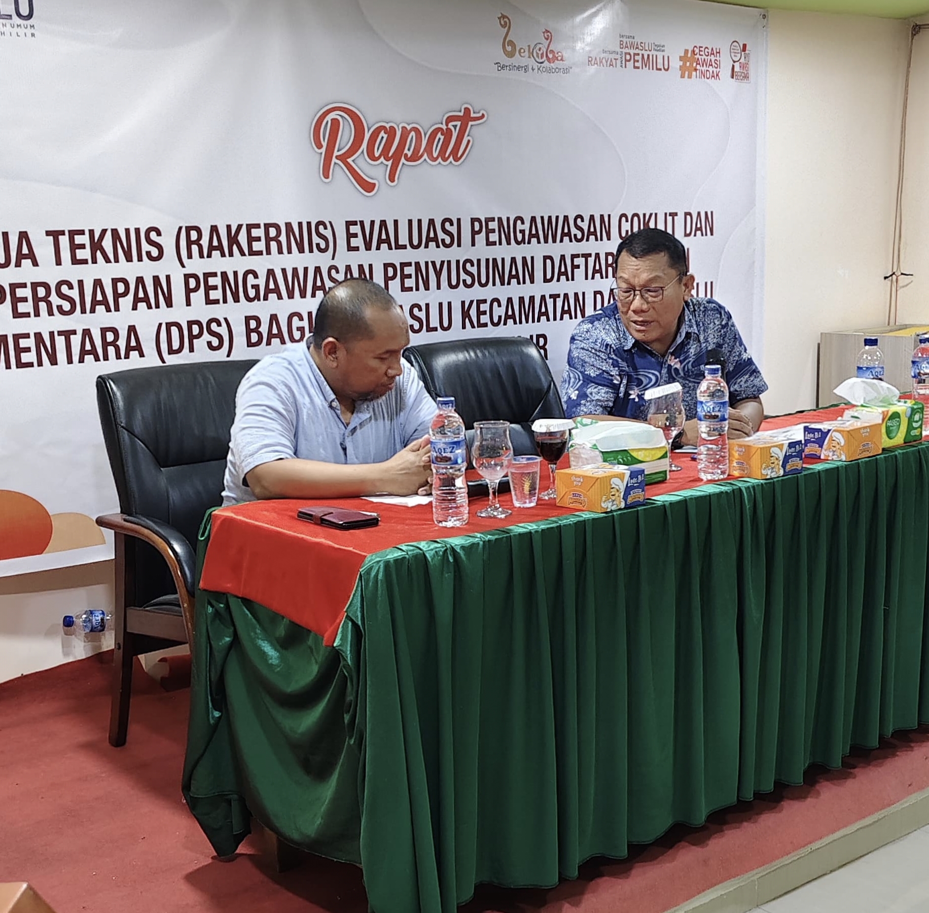 Rapat Kerja Teknis Evaluasi Pengawasan Coklit dan Pengawasan Penyusunan Daftar Pemilih Sementara menghadirkan narasumber diantaranya, Perhimpunan Pemilih Indonesia (PPI) Koordinator Provinsi Riau, Network for Indonesiaan Democraty Society (Netfid) Provinsi Riau dan Kesbangpol Rokan Hilir. (Hermanto)