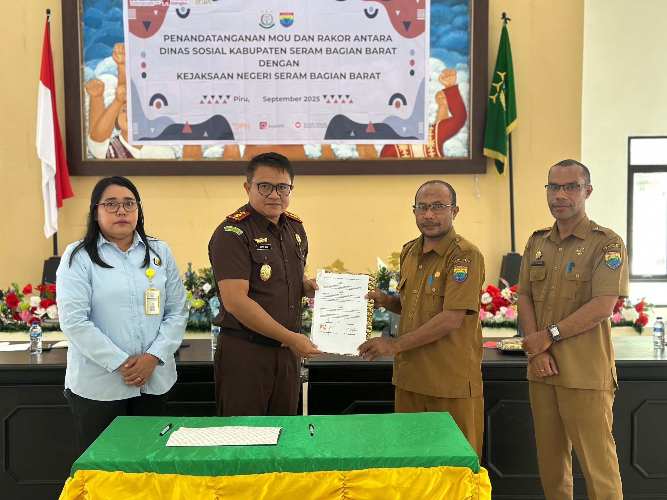 Fiacentral.com |Piru, 23 September 2025 – Kepala Kejaksaan Negeri Seram Bagian Barat Anto Widi Nugroho, S.H., M.H didampingi Kasi Datun Kejari SBB Sesca Taberima, S.H., M.H bersama Dinas Sosial Kabupaten Seram Bagian Barat melaksanakan kegiatan Penandatanganan Nota Kesepahaman (MoU) dan Rapat Koordinasi dan terkait Penerbitan Akte Lahir dan Kartu Identitas Anak (KIA) pada Lembaga Kesejahteraan Sosial Anak (LKSA) se-Kabupaten Seram Bagian Barat pada hari ini.